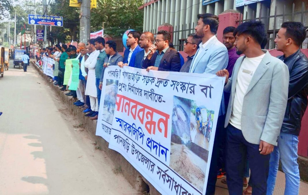 খাগড়াছড়ি-পানছড়ি সড়ক পূনঃ নির্মাণ বা মানসম্মত সংস্কারের দাবীতে মানববন্ধন ও স্বারক লিপি প্রদান করা হয়েছে। আজ মঙ্গলবার (১০ ডিসেম্বর) খাগড়াছড়ি প্রেসক্লাবের সামনে এ মানববন্ধন অনুষ্ঠিত হয়।