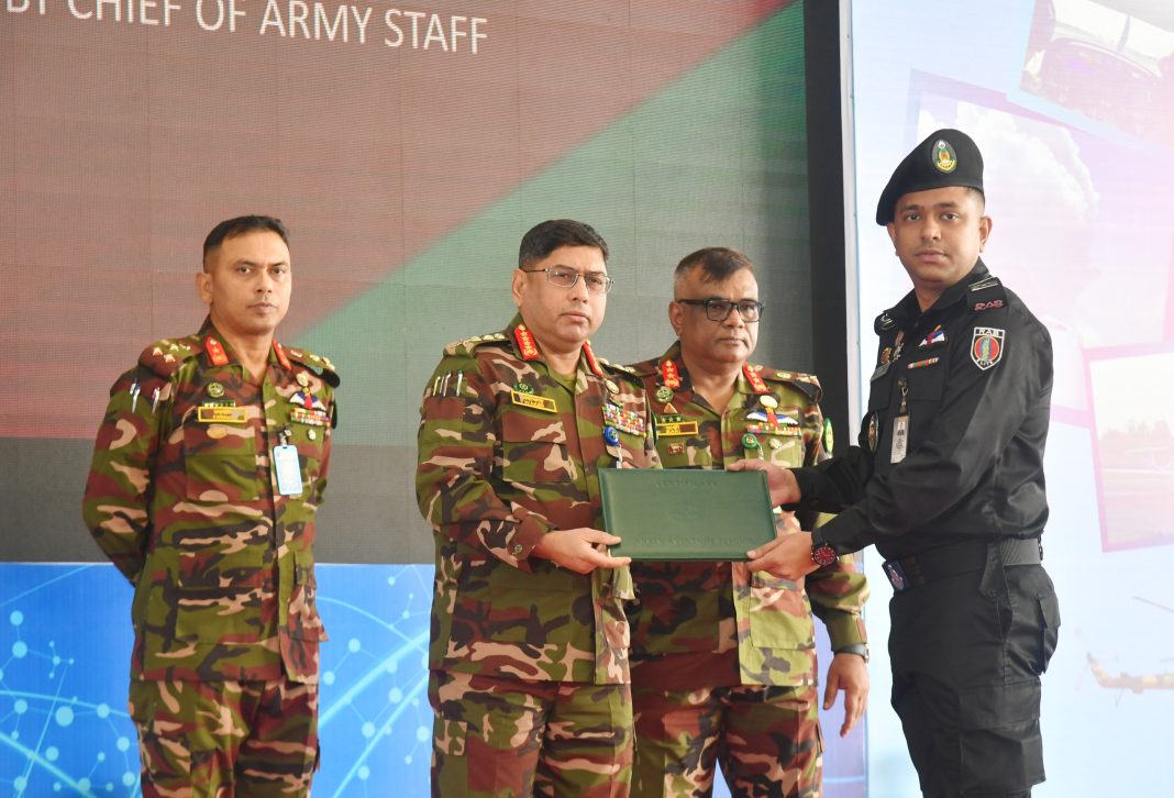 সেনাবাহিনী প্রধান জেনারেল ওয়াকার-উজ-জামান, এসবিপি, ওএসপি, এসজিপি, পিএসসি প্রধান অতিথি হিসেবে আজ বুধবার সকালে আর্মি এভিয়েশন স্কুলে নবীন বৈমানিকদের সার্টিফিকেট প্রদান করেন ও ফ্লাইং ব্রেভেট পরিয়ে দেন। ইন্সপেক্টর জেনারেল অব পুলিশ, বাংলাদেশ বাহারুল আলম বিপিএম এবং উচ্চপদস্থ সামরিক ও বেসামরিক কর্মকর্তাগণ অনুষ্ঠানে উপস্থিত ছিলেন।