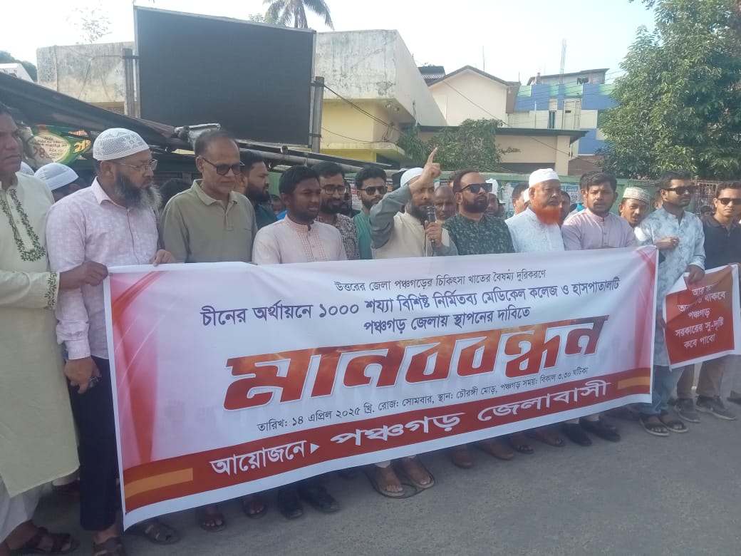 চিনের অর্থায়নে ১০০০ শস্য বিশিষ্ট নির্মিত মেডিকেল কলেজ ও হাসপাতালটি পঞ্চগড় জেলায় স্থাপনের দাবিতে মানববন্ধন অনুষ্ঠিত হয়েছে সোমবার ( ১৪ এপ্রিল ) বিকেলে পঞ্চগড় শেরেবাংলা পার্কে পঞ্চগড় জেলা বাসির ব্যানারে এই মানববন্ধন অনুষ্ঠিত হয়।