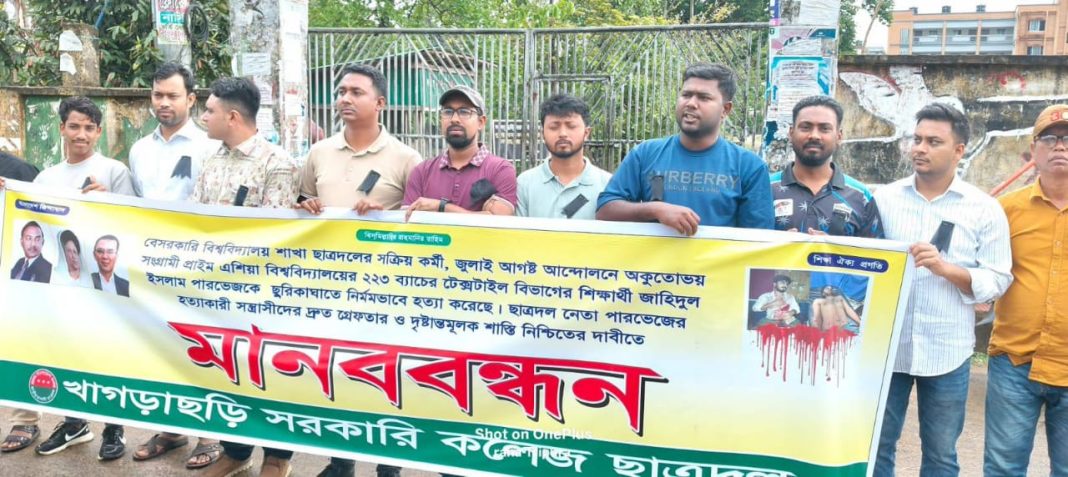 একই সময় ছাত্রনেতারা, জুলাই আন্দোলনের অকুতভয় যোদ্ধা ও প্রাইম এশিয়া বিশ্ববিদ্যালয়ের ২২৩ ব্যাচের টেক্সটাইল বিভাগের শিক্ষার্থী ছাত্রদল নেতা জাহিদুল ইসলাম পারভেজ হত্যায় জড়িত খুনীদের দৃষ্টান্তমূলক শাস্তির দাবি জানান মানববন্ধন থেকে।