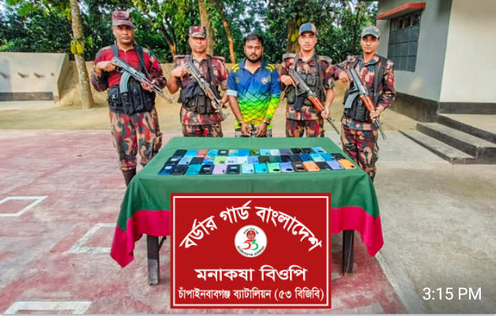 চাঁপাইনবাবগঞ্জ মনাকষা সীমান্ত ২১ এপ্রিল ২০২৫ তারিখ সকাল ০৬টার সময় মনাকষা বিওপির একটি বিশেষ টহলদল চাঁপাইনবাবগঞ্জ জেলার শিবগঞ্জ থানাধীন দূর্লভপুর ইউনিয়নের বাররশিয়া গ্রামে একটি বিশেষ অভিযান পরিচালনা করার সময় ০১ জন ব্যক্তিকে ০১টি ব্যাগ নিয়ে আসতে দেখতে পায়। টহলদল তার গতিবিধি সন্দেহ হওয়ায় থামার সংকেত দিলে সে দৌড়ে পালিয়ে যাওয়ার চেষ্টা করে। পরবর্তীতে টহলদল তাকে ধাওয়া করে মোঃ হানজালা (২৫), পিতা- ফেত্তার হাজী, গ্রাম-কোট বাজার দেওয়ান জাইগীর, পোস্ট- শিবগঞ্জ, থানা-শিবগঞ্জ, জেলা-চাঁপাইনবাবগঞ্জকে ৪৫টি ভারতীয় মোবাইলসহ আটক করে। আটককৃত আসামীর বিরুদ্ধে যথাযথ আইনানুগ ব্যবস্থা গ্রহণের নিমিত্তে জব্দকৃত মোবাইলসহ শিবগঞ্জ থানায় হস্তান্তর করার কার্যক্রম প্রক্রিয়াধীন।