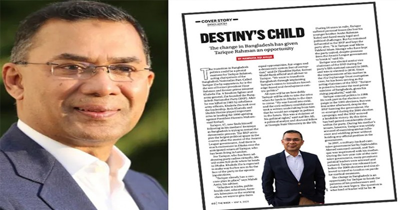 প্রতিবেদনে আরো বলা হয়, ৫৭ বছর বয়সী তারেক এখন তার মায়ের পদাঙ্ক অনুসরণ করছেন, কারণ বাংলাদেশ গণতান্ত্রিক প্রক্রিয়া পুনরায় শুরু করার চেষ্টা করছে। সাপ্তাহিক নিউজ ম্যাগাজিন ‘দ্য উইক’-এর চলতি সংখ্যার কাভার স্টোরি ‘ডেসটিনি’স চাইল্ড’-এর বাংলা অনুবাদ পাঠকের উদ্দেশ্যে নিচে তুলে ধরা হলো।