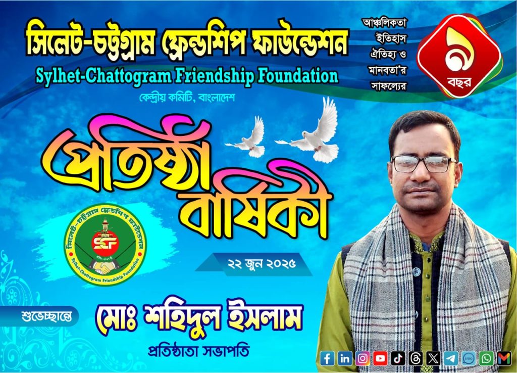 মানবিক সংগঠন সিলেট-চট্টগ্রাম ফ্রেন্ডশিপ ফাউন্ডেশনের ৯তম প্রতিষ্ঠা বার্ষিকী উপলক্ষে মোঃ শহিদুল ইসলামের শুভেচ্ছা বাণীতে বলেন “প্রতিষ্ঠার অমূল্য বছরে, আমাদের সামাজিক সংগঠন সমাজের উন্নয়নে আরও একধাপ এগিয়ে যাক, এই শুভক্ষণে আমাদের আন্তরিক শুভেচ্ছা ও শুভকামনা। আমাদের সকলের সম্মিলিত প্রচেষ্টায় গড়ে উঠুক একটি সুন্দর, সমৃদ্ধ এবং মানবিক সমাজ।”