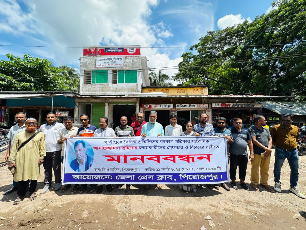 গাজীপুরে সাংবাদিক আসাদুজ্জামান তুহিনকে প্রকাশ্যে কুপিয়ে হত্যার ঘটনায় দোষীদের দৃষ্টান্তমূলক শাস্তির দাবিতে পিরোজপুরে মানববন্ধন অনুষ্ঠিত হয়েছে। সোমবার (১১ আগস্ট) সকাল ১০.৩০ মিনিটে সিও অফিস গোল চত্বর জেলা প্রেসক্লাব, পিরোজপুর এর অস্থায়ী কার্যালয়ে জেলা প্রেসক্লাব পিরোজপুর এর উদ্যোগে এ কর্মসূচি পালিত হয়।