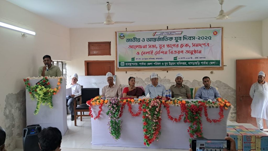 “প্রযুক্তি নির্ভর বহুপাক্ষিক অংশীদারিত্বে অগ্রগতি” এই শ্লোগানে খাগড়াছড়িতে জাতীয় ও আন্তজার্তিক যুব দিবস পালন করা হয়েছে। মঙ্গলবার সকালে খাগড়াছড়ি যুব উন্নয়ন অধিদপ্তর সম্মেলন কক্ষে পার্বত্য জেলা পরিষদ ও যুব উন্নয়ন অধিদপ্তর এ অনুষ্টানের আয়োজন করে । দিবসটি উপলক্ষে আলোচনা সভা, যুব ঋনের চেক বিতরন, সেলাই মেশিন বিতরন , বৃক্ষ রোপন,মৎস্য অবমুক্ত করন প্রশিক্ষণের সনদ বিতরণ ও যুব র্যালির করা হয়। অনুষ্টানের শুরুতে বেলুন উড়িয়ে যুব দিবসের শুভ সুচনা করেন প্রধান অতিথি পার্বত্য জেলা পরিষদের সদস্য নিটল মণি চাকমা।