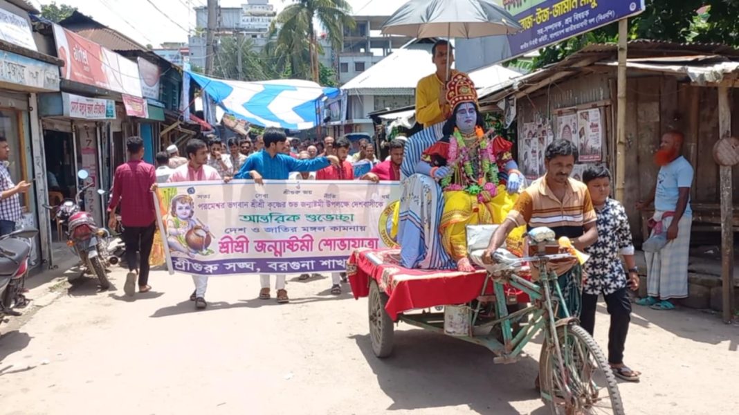 বরগুনায় শ্রীকৃষ্ণের জন্মাষ্টমী উপলক্ষে আজ শনিবার সকাল সাড়ে ১১টায় সদর উপজেলার সার্বজনীন আখড়াবাড়ি মন্দিরে বাংলাদেশ পূজা উদযাপন পরিষদ ও পূজা উদযাপন ফোরামের উদ্যোগে আলোচনা সভা ও বর্ণাঢ্য শোভাযাত্রার আয়োজন করা হয়।
