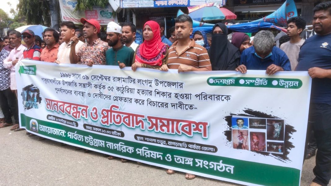 ১৯৯৬ সালের ৯ সেপ্টেম্বর রাঙামাটির লংগদু উপজেলার পাকুয়াখালীতে উপজাতি সন্ত্রাসীদের হাতে ৩৫ জন বাঙালি হত্যার শিকার হওয়া পরিবারকে পুনর্বাসন ব্যবস্থা ও দোষীদের গ্রেফতারের দাবিতে মানববন্ধন ও প্রতিবাদ সমাবেশ করেছে পার্বত্য চট্টগ্রাম নাগরিক পরিষদ।