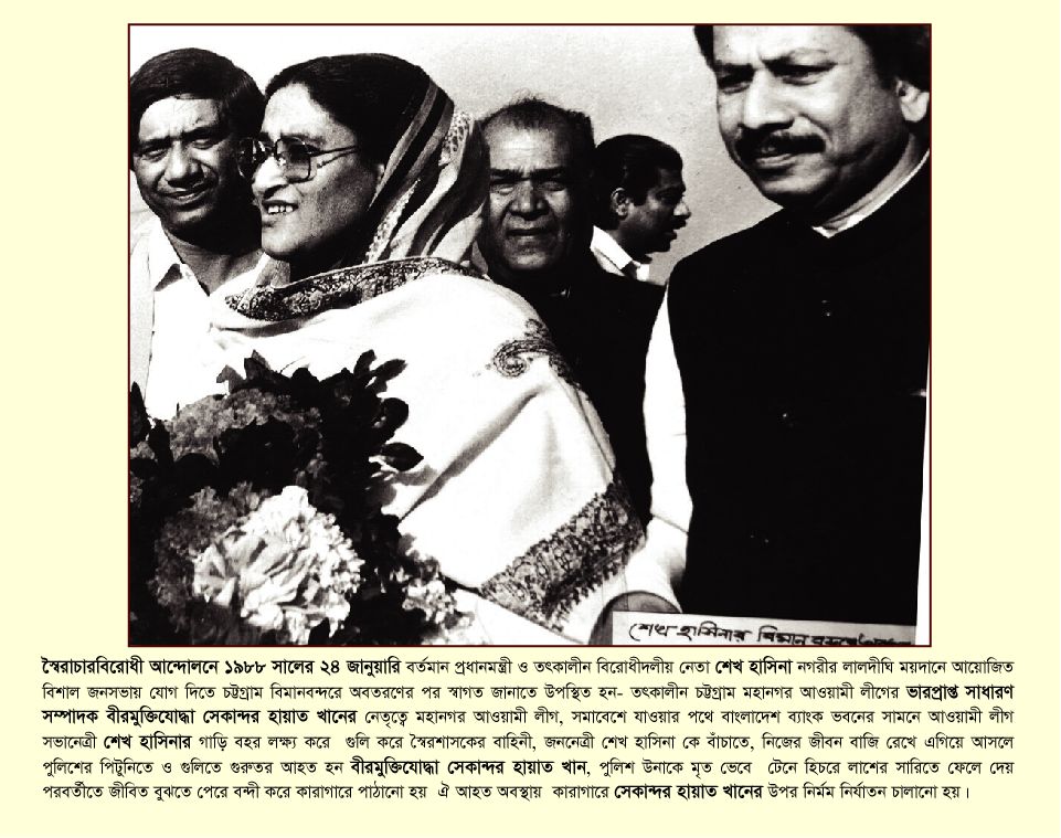 ১৯৮৮ সালের ২৪ জানুয়ারি নগরের লালদীঘি মাঠে আওয়ামী লীগের সমাবেশে আওয়ামী লীগ সভানেত্রী বঙ্গবন্ধু কন্যা দেশরত্ন শেখ হাসিনার যোগদানের আগ মুহুর্তে, নেত্রীর গাড়ি বহর নিউমার্কেট মোড় অতিক্রম করে জিপিও’র সামনে আসে। তখন আচমকা গর্জে উঠে চট্টগ্রাম নগর পুলিশের রাইফেল। পুলিশের এলোপাথাড়ি গুলিতে একে একে ২৪ জন মৃত্যুর কোলে ঢলে পড়েন। আহত হন আরো দু’শতাধিক নেতাকর্মী। পুলিশের এলোপাতাড়ি গুলি বর্ষণের সময় মানববেষ্টনী তৈরি করে শেখ হাসিনাকে চট্টগ্রাম জেলা আইনজীবী সমিতি ভবনে নিয়ে যাওয়া হয়। সেদিন গ্রেপ্তারও হয়েছিলেন বীর মুক্তিযোদ্ধা সেকান্দর হায়াৎ খানসহ অসংখ্য নেতা কর্মী।