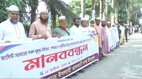 ৫ দফা বাস্তবায়নের দাবিতে ঝালকাঠির চাঁদকাঠী থেকে সাধনার মোড় এক কিলো মিটার পর্যন্ত মানববন্ধনে কয়েক শতাধিক জামায়াত নেতাকর্মীরা অংশগ্রহন করে।