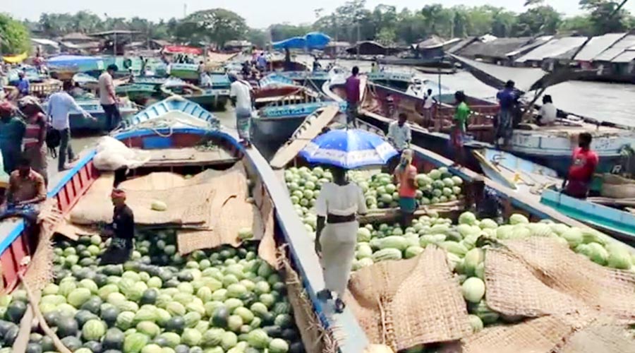 সরেজমিনে তরমুজের ভাসমান হাট ঘুরে দেখা গেছে, প্রচন্ড রৌদ্রের মধ্যে বিক্রেতারা নৌকায় ও ট্রলারে করে বিভিন্ন আকারের তরমুজের পসরা সাজিয়ে বসে আছে।