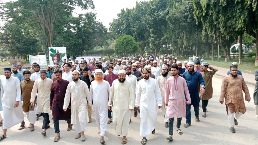 গাজীপুরের কালিয়াকৈরে হিন্দু যুবক কর্তৃক মাদ্রাসা ছাত্রীকে ধর্ষণের প্রতিবাদে বিক্ষোভ মিছিল করেছেন ইসলামী বিশ্ববিদ্যালয়ের (ইবি) শিক্ষক ও শিক্ষার্থীরা।